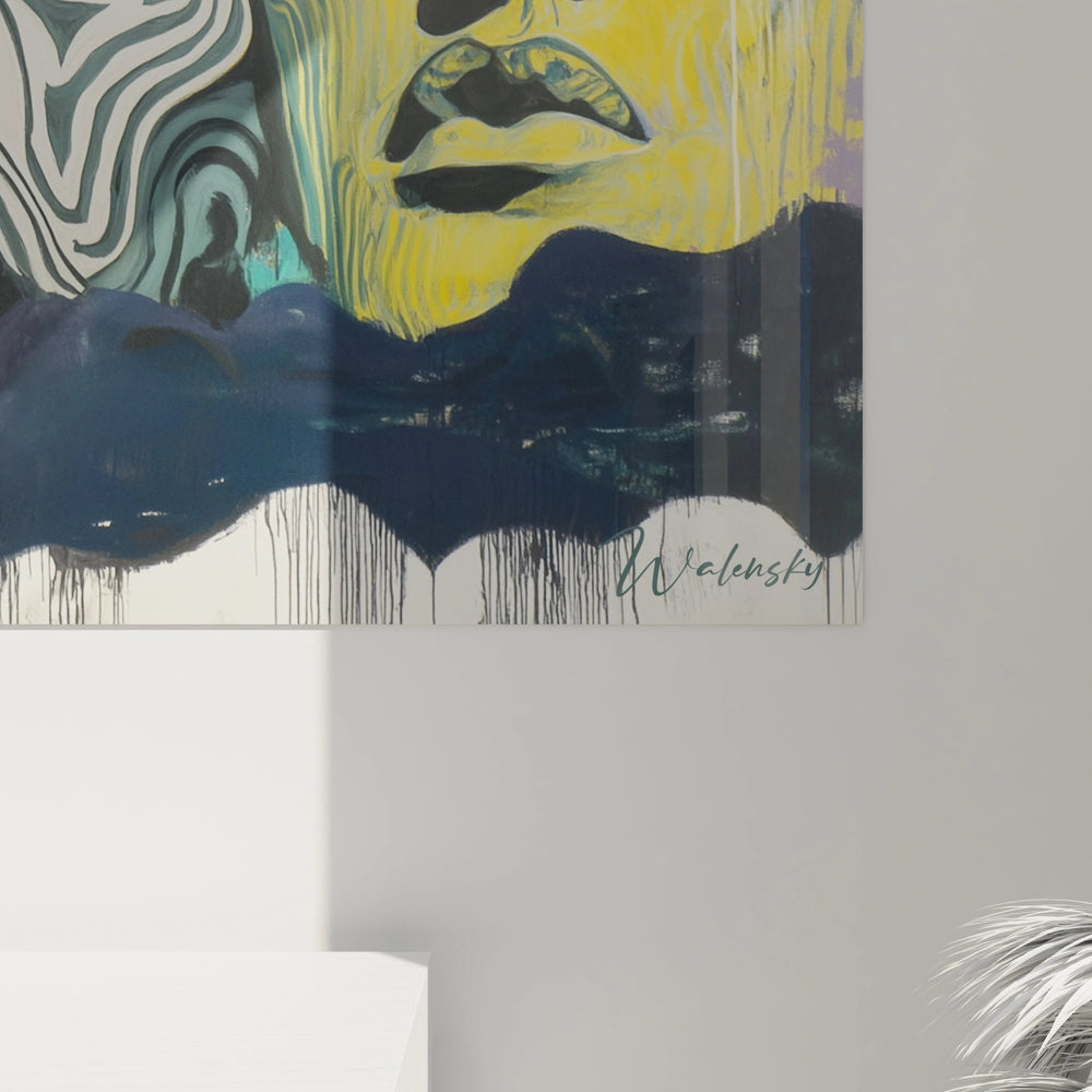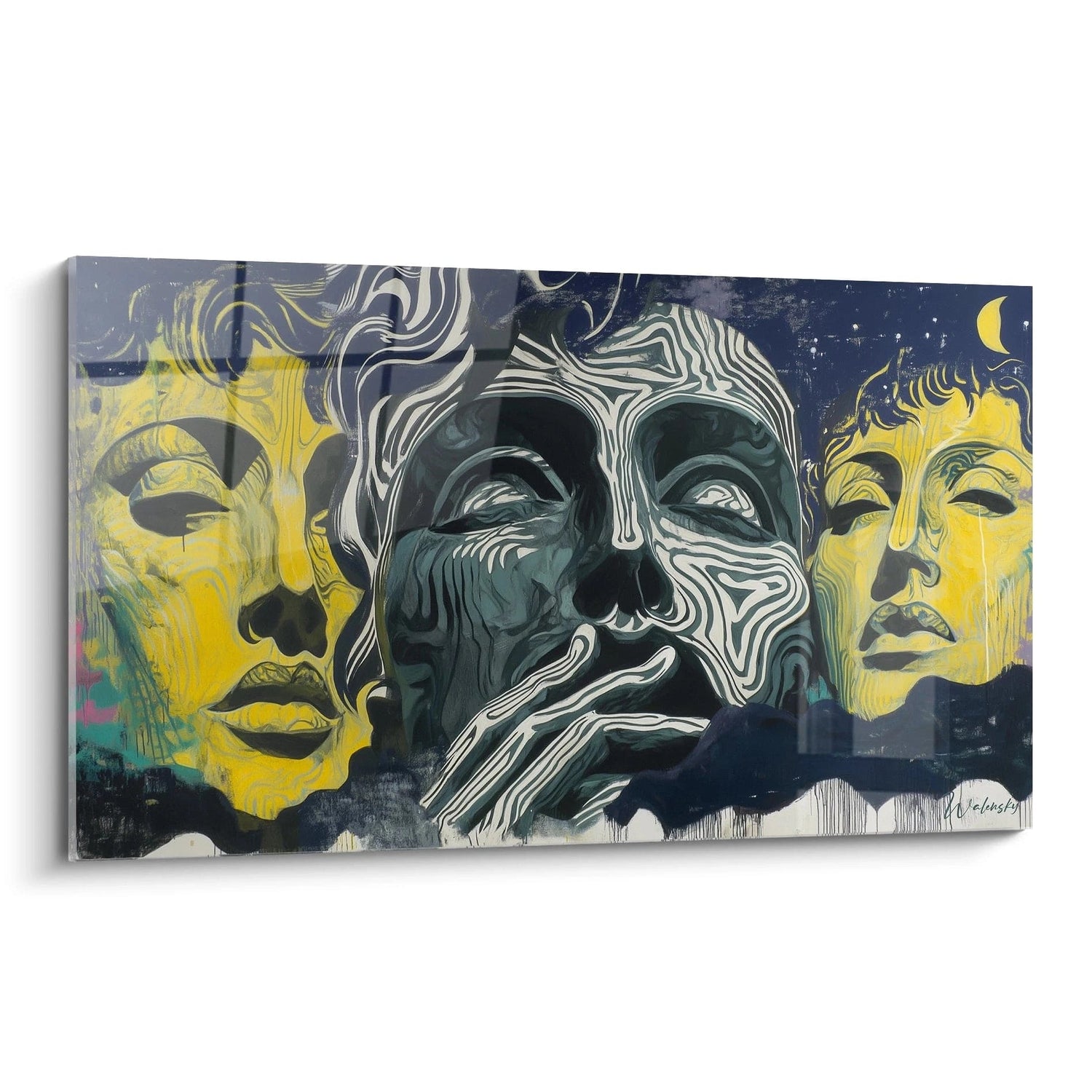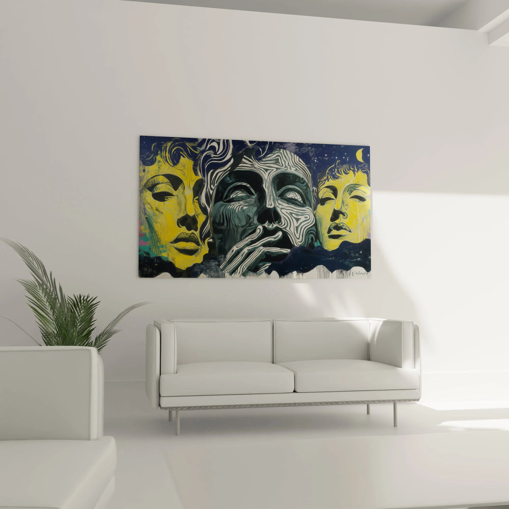 Les textures révèlent une technique mixte combinant peinture acrylique et effets graphiques. Les visages jaunes présentent une surface lisse contrastant avec les motifs fluides et organiques du crâne central. Le tableau visages technique mixte exploite les effets de matière pour créer des reliefs visuels captivants. Les détails techniques montrent des coulures contrôlées, des empâtements subtils et des glacis transparents. L'artiste maîtrise parfaitement les effets de lumière et d'ombre pour sculpter chaque visage. Les motifs psychédéliques du centre utilisent une technique de lignes fluides rappelant l'art optique. Cette décoration murale visages moderne démontre une expertise technique remarquable dans l'alliance de différents styles picturaux.