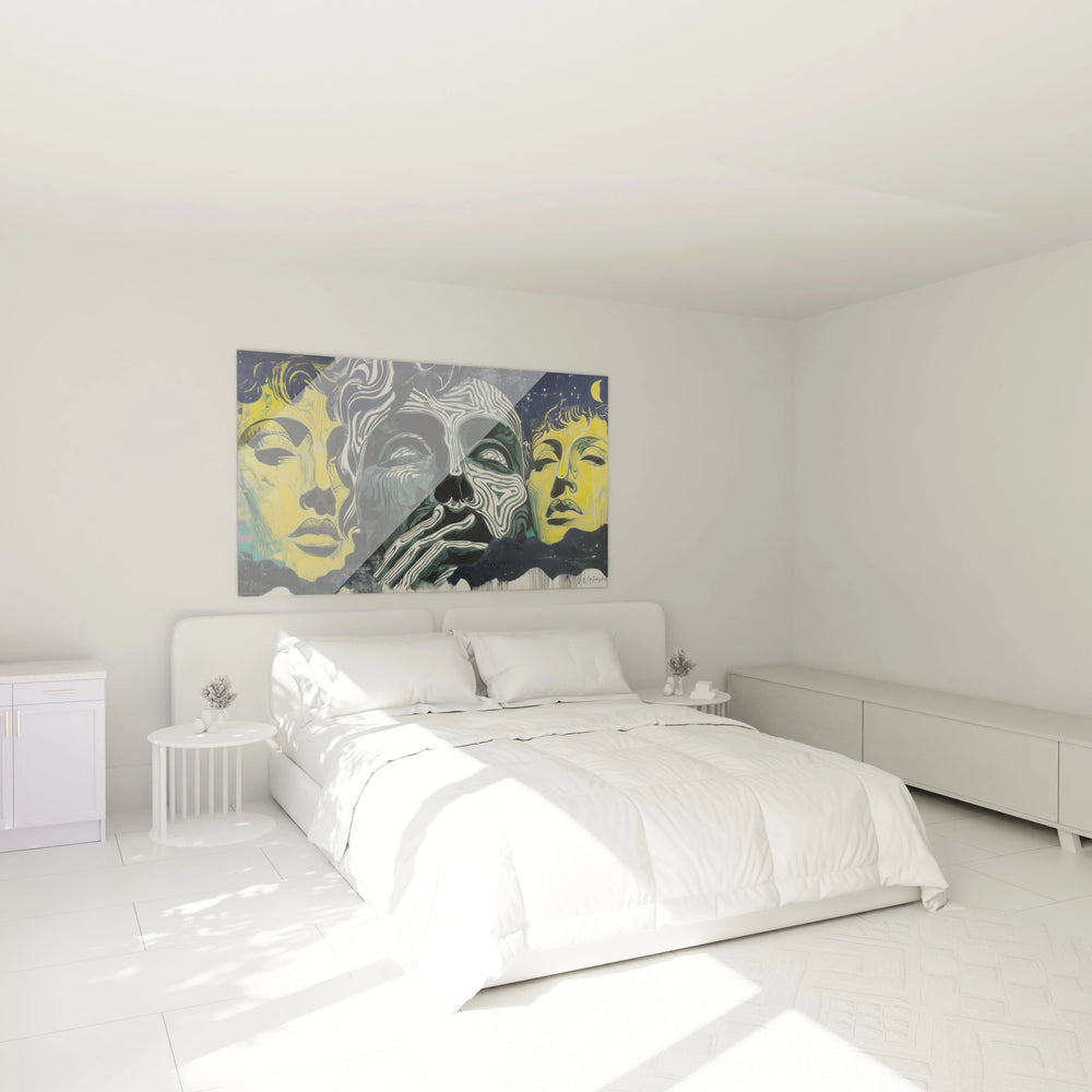 L'unicité de cette œuvre réside dans sa capacité à fusionner trois approches artistiques distinctes au sein d'une seule composition. Le tableau visages expressionniste urbain se distingue par son traitement différencié de chaque personnage : réalisme stylisé pour les visages latéraux, abstraction psychédélique pour l'élément central. Les expressions faciales contrastées - mélancolie à gauche, sérénité à droite - encadrent une représentation symbolique de la mortalité. Cette art mural visages philosophique transforme un triptyque classique en manifeste contemporain. La signature discrète en bas à droite authentifie cette création originale. L'aspect impossible à dupliquer provient de cette alchimie unique entre styles, couleurs et symbolisme existentiel.