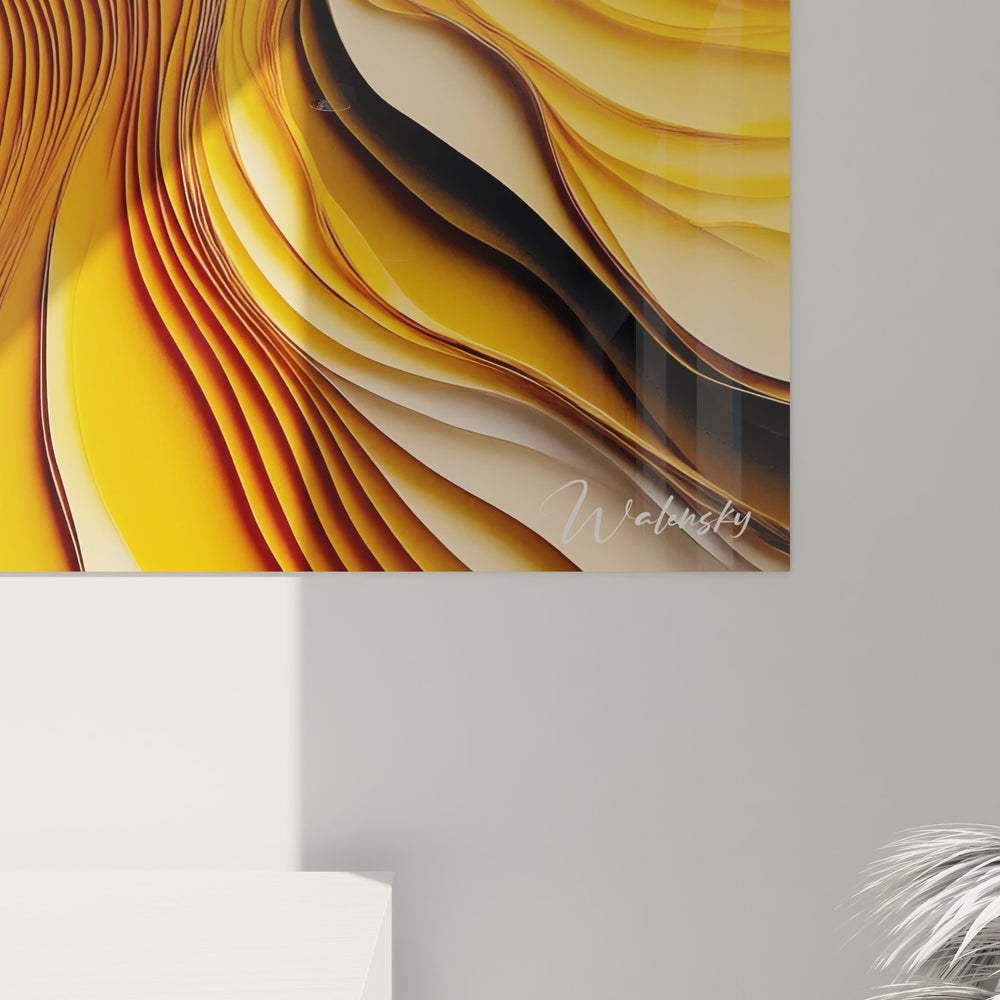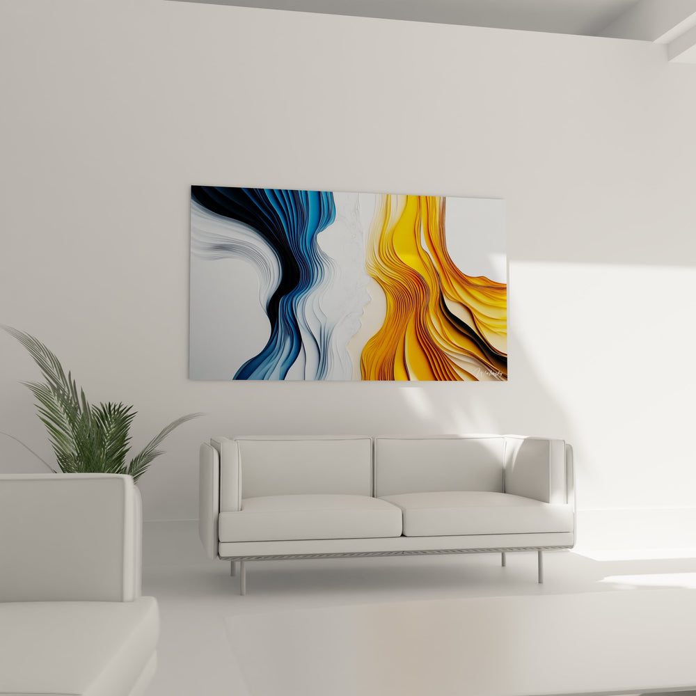 Ce tableau mural moderne présente une composition saisissante de visages stylisés aux contours ondulés qui semblent se faire face dans un dialogue silencieux. L'œuvre révèle deux profils humains créés par des lignes fluides abstraites qui s'entremêlent harmonieusement sur la toile. La partie gauche dévoile un visage formé par des courbes bleues profondes, tandis que la droite s'épanouit en ondulations dorées et orangées. Cette décoration murale contemporaine joue magistralement avec les volumes et les reliefs, créant une impression de mouvement perpétuel. Les formes organiques semblent respirer et danser, évoquant la fluidité de la pensée humaine et l'expression des émotions. Chaque courbe est délicatement travaillée pour créer un effet tridimensionnel saisissant, transformant ce tableau abstrait géométrique en véritable sculpture murale. L'artiste a su capturer l'essence même de la communication non-verbale à travers ces silhouettes artistiques modernes qui transcendent la représentation classique du portrait.