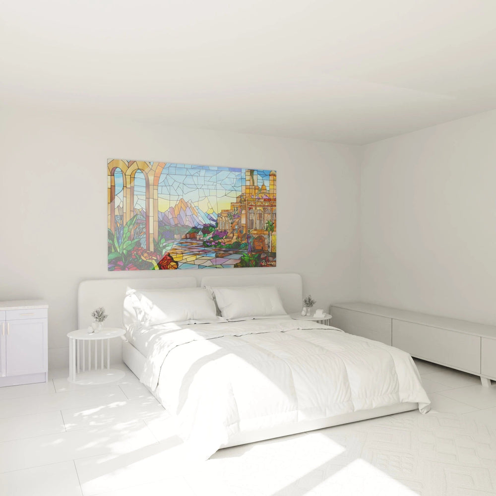 Ce tableau vitraux paysage captive immédiatement par sa représentation éblouissante d'un panorama oriental où architecture majestueuse et nature luxuriante s'entremêlent. L'œuvre présente une composition fragmentée typique du style vitrail, avec des arches imposantes à gauche ouvrant sur un paysage montagneux coloré et un palais majestueux sur la droite. La technique de segmentation crée une mosaïque chromatique où chaque section s'illumine comme traversée par une lumière divine.