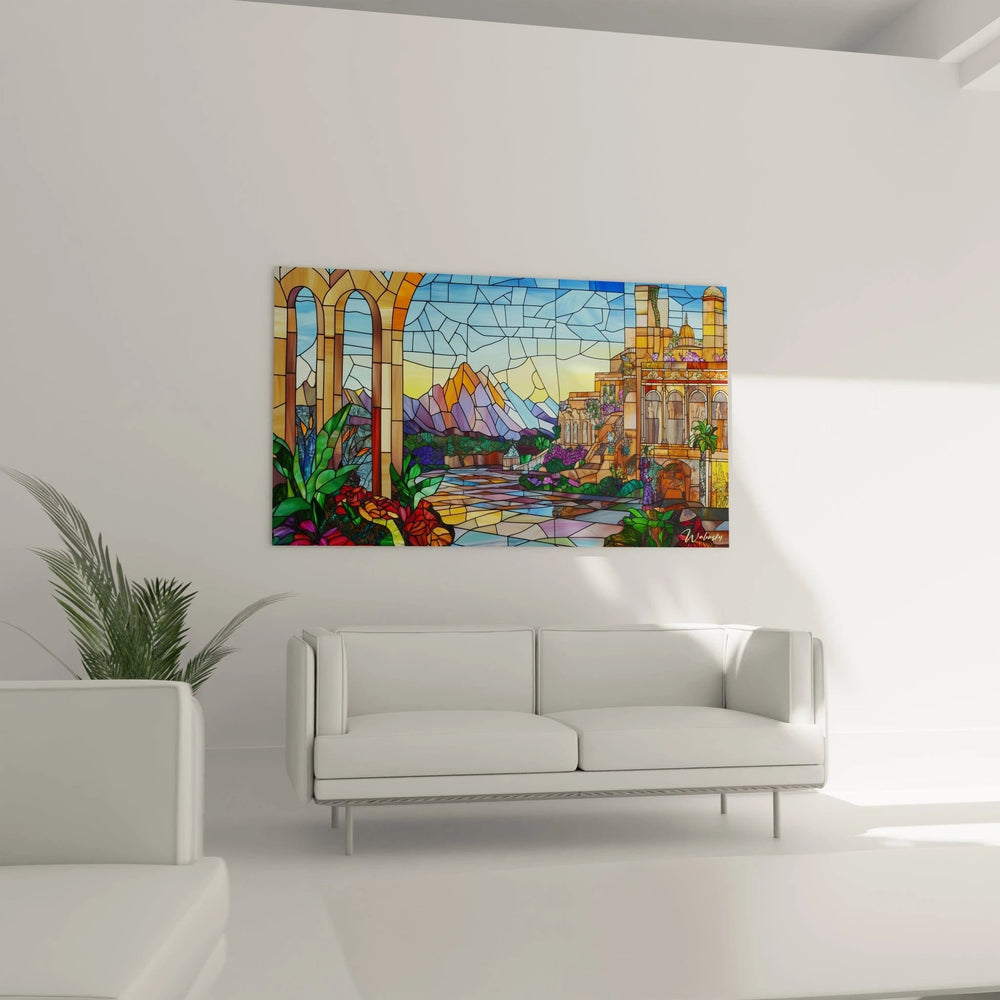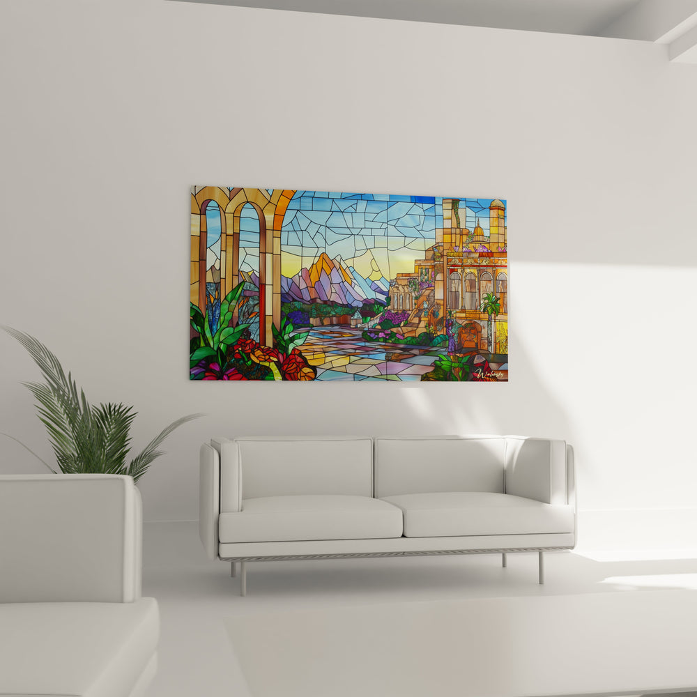 La composition de ce tableau vitraux architectural oriental est stratégiquement équilibrée entre éléments architecturaux et naturels. Les arches monumentales à gauche servent de point d'entrée visuel, encadrant la vue sur les montagnes prismatiques qui occupent l'arrière-plan central. Le chemin sinueux au centre guide notre regard vers le palais complexe situé à droite, créant un parcours visuel circulaire.