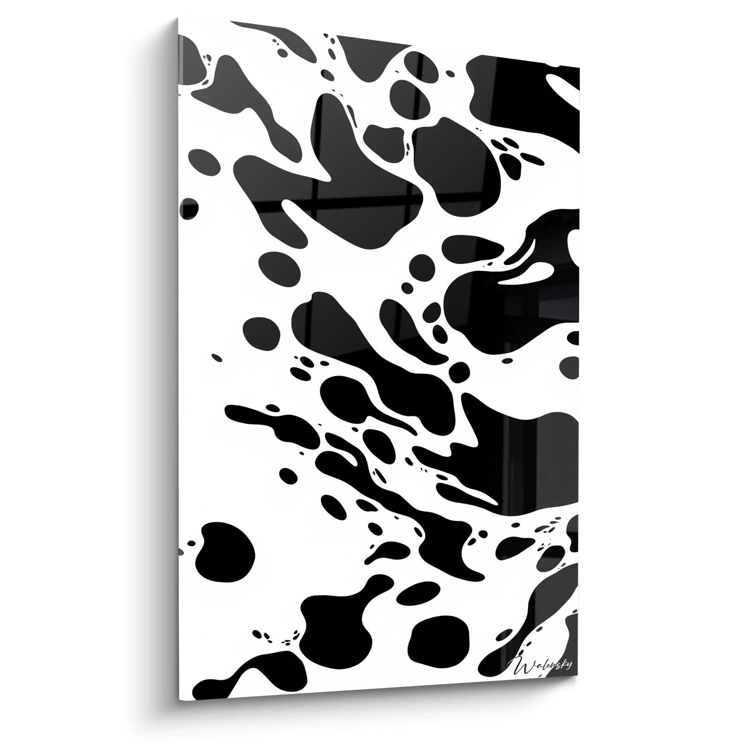 Ce tableau abstrait révèle une composition saisissante où dominent les contrastes purs entre le noir et le blanc. L'œuvre présente un ensemble de formes organiques fluides qui semblent danser sur la toile, créant un mouvement perpétuel captivant. Ce tableau abstrait moderne se distingue par sa capacité à évoquer simultanément le chaos contrôlé et l'harmonie naturelle. Les taches noires aux contours irréguliers s'éparpillent avec une spontanéité calculée, offrant une expérience visuelle qui interpelle immédiatement le regard. Cette décoration murale abstraite transforme l'espace par sa présence magnétique et son impact graphique indéniable.