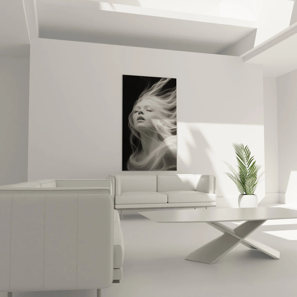 Ce tableau visage féminin en mouvement révèle une maîtrise exceptionnelle des textures visuelles. La peau du visage présente une qualité porcelainée, presque translucide, qui contraste avec la texture vaporeuse et aérienne des cheveux. Ces derniers semblent avoir été capturés dans un instant suspendu, défiant les lois de la gravité avec leurs filaments lumineux qui se déploient dans l'espace.