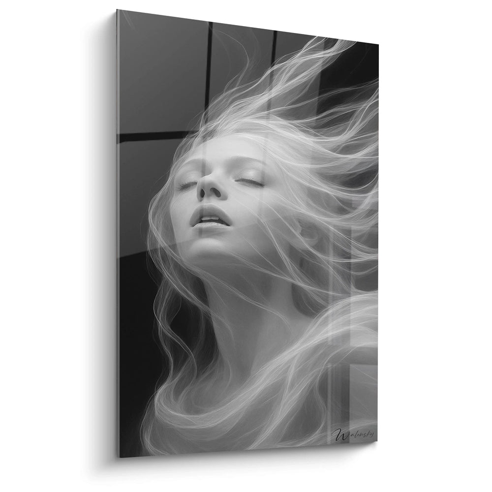 Ce tableau visage éthéré saisit l'instant où la matière devient illusion, où le tangible flirte avec l'invisible. L'œuvre présente un portrait féminin d'une délicatesse saisissante, capturé dans un moment de plénitude contemplative. Les cheveux, semblables à des filaments de lumière, se déploient dans l'espace comme suspendus par une force invisible, créant un effet de mouvement perpétuel.