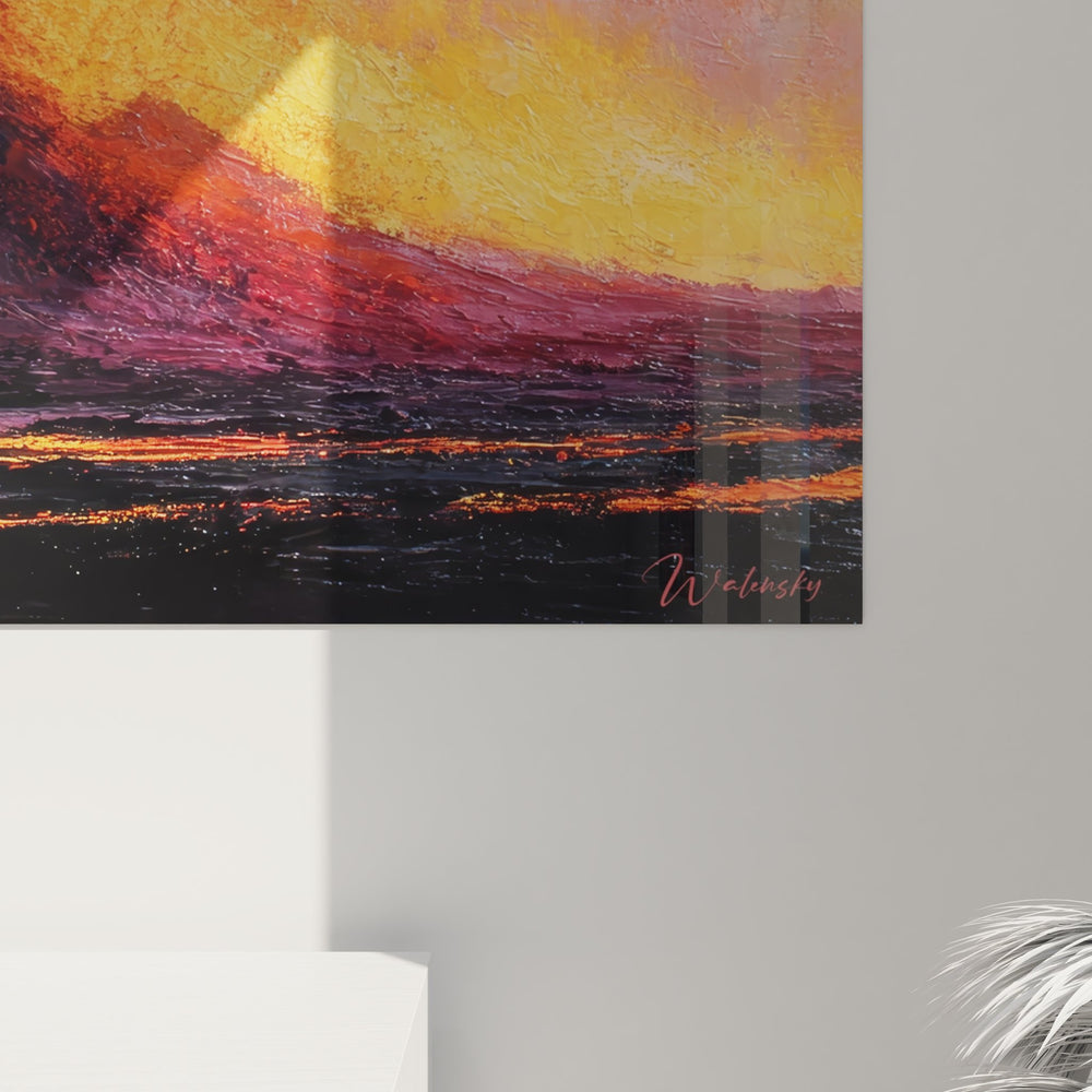 Imaginez-vous devant cette pièce unique, où le rouge incandescent du magma se juxtapose aux teintes orange et violettes d’un soleil couchant. Ce tableau ne se contente pas d’être un élément de décoration ; il incarne une expérience visuelle qui invite à la contemplation, à la réflexion et à l’admiration. L'expression artistique ici est non seulement une représentation, mais également une invitation à ressentir la force et la beauté sauvage des volcans.
