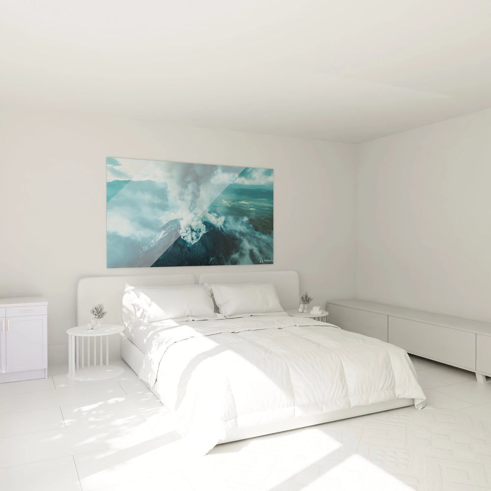 Chaque dĂ©tail de ce tableau raconte une histoire vibrante. La fumĂ©e volcanique, dense et tourbillonnante, sâĂ©lĂšve dans un ciel dramatique aux nuances profondes de gris et de bleu, tandis que la neige scintille dâune blancheur Ă©clatante qui apaise le regard. Ce jeu dâombres et de lumiĂšres crĂ©e une atmosphĂšre Ă la fois puissante et sereine, oĂč le chaos et la beautĂ© sâentrelacent dans une harmonie rare.