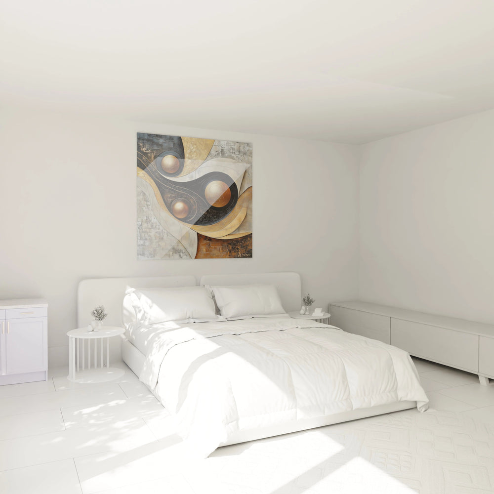 Cette œuvre abstraite se distingue par son approche architecturale de la composition abstraite. L'intégration parfaite des éléments tridimensionnels avec les formes bidimensionnelles crée une profondeur exceptionnelle rarement observée dans ce style artistique. Le tableau abstrait sphères dorées développe un langage visuel original où chaque courbe répond à une autre dans une conversation plastique sophistiquée. La signature discrète en bas à droite confirme l'authenticité de cette décoration murale abstraite exclusive. Les proportions mathématiquement équilibrées et la précision de l'exécution témoignent d'une maîtrise technique remarquable, faisant de cette pièce un exemplaire unique dans l'art contemporain abstrait.