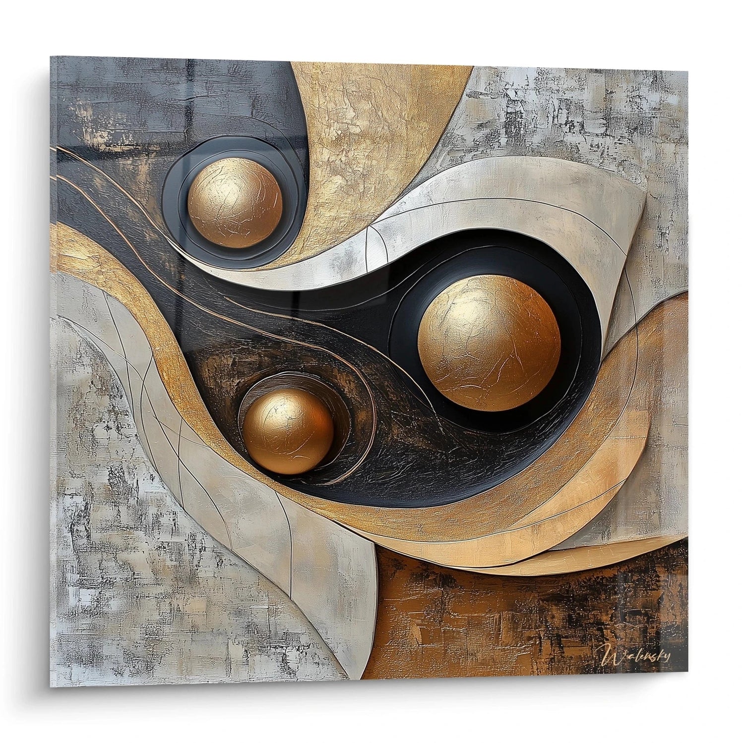 Ce tableau abstrait contemporain révèle une composition sophistiquée dominée par des formes circulaires et des courbes fluides. L'œuvre présente trois sphères dorées parfaitement intégrées dans un ensemble de formes géométriques ondulantes qui créent un mouvement perpétuel à travers la surface. Le tableau abstrait moderne se distingue par son équilibre entre textures rugueuses et surfaces lisses, offrant une profondeur visuelle remarquable. Les éléments circulaires semblent flotter dans un environnement architectural composé de courbes entrecroisées, créant une harmonie visuelle captivante qui attire immédiatement l'attention.