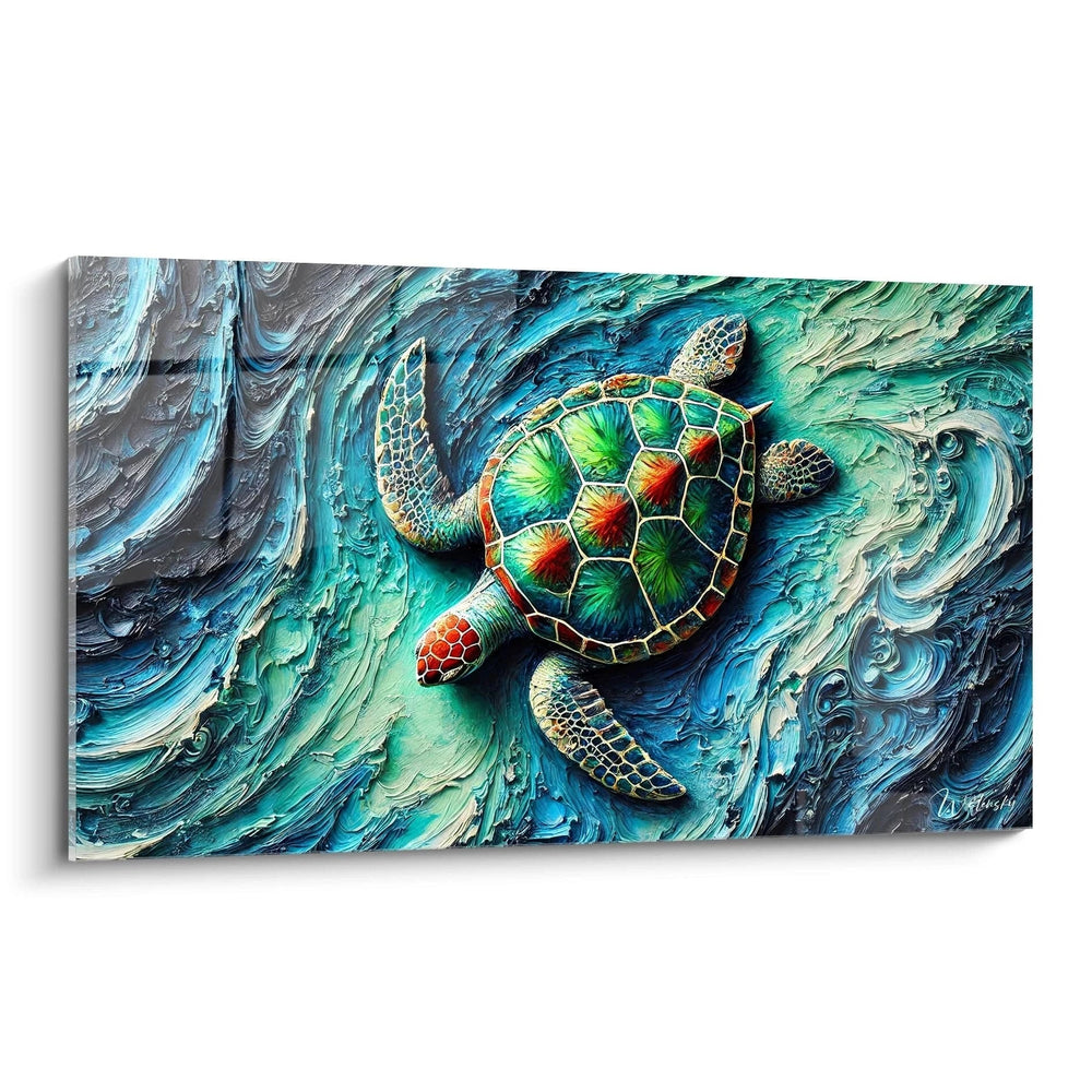 Ce tableau est bien plus qu’une simple œuvre d’art, c’est une expérience sensorielle et une échappée belle vers un univers apaisant. La tortue, symbole de sagesse et de longévité, y évolue entre des teintes vibrantes de turquoise, bleu profond et touches lumineuses, donnant vie à un spectacle où le mouvement et la sérénité cohabitent. Chaque regard posé sur cette composition évoque la sensation d’une brise marine légère, le doux murmure des vagues et l’appel hypnotique des eaux cristallines.