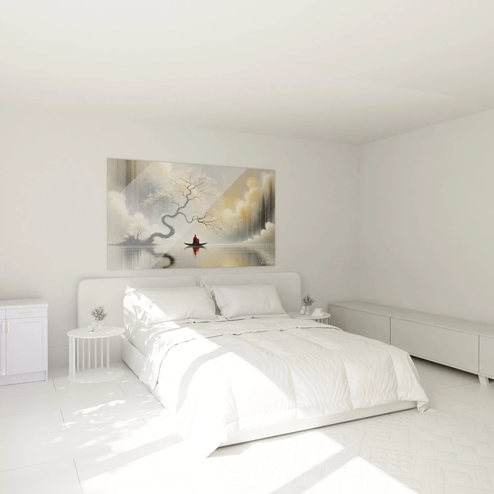 Au cœur de cette composition, une silhouette assise paisiblement dans un bateau glisse sur une eau miroir, symbolisant l’union parfaite entre l’humain et l’univers. Vous laissez votre regard se balader sur les courbes fluides et délicates de l’arbre, sur les nuages fins qui semblent caresser le ciel, ressentant lentement ce souffle d’énergie qui anime le tableau.