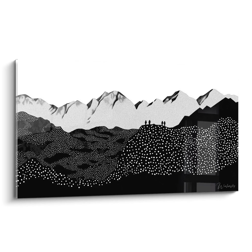 Ce tableau montagne se distingue par sa technique pointilliste appliquée à un paysage alpin saisissant en noir et blanc. L'œuvre présente une chaîne de sommets enneigés qui se détachent majestueusement sur un ciel clair, tandis que les vallées sombres créent un contraste dramatique. La première impression révèle un tableau montagne technique pointillée d'une rare intensité visuelle, où chaque point blanc scintille comme un cristal de neige suspendu dans l'air glacial. Cette décoration murale montagne capture l'essence même de la haute altitude, transformant l'espace par sa présence imposante et sereine. Les détails pointillés créent une texture hypnotique qui attire immédiatement le regard. Les petites silhouettes humaines intégrées dans le paysage apportent une dimension narrative touchante, soulignant l'immensité de ces sommets éternels dans cette œuvre montagne contemporaine.
