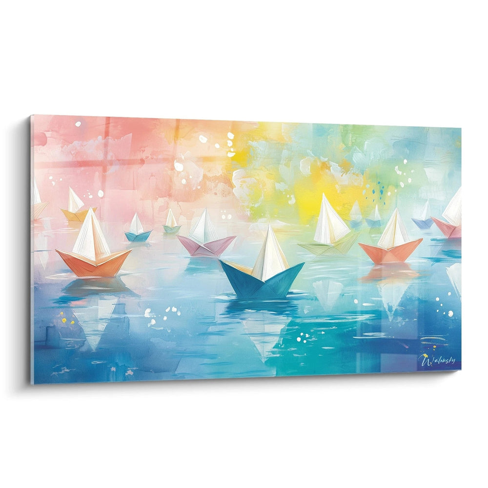 Ce tableau bateaux papier révèle une scène poétique où une flottille d'embarcations en origami navigue sur des eaux miroitantes aux reflets multicolores. L'œuvre capture instantanément l'attention par sa douceur onirique et son atmosphère contemplative. Les tableau bateaux papier multicolore se détachent harmonieusement contre un fond aquatique aux nuances bleues profondes, créant un contraste saisissant avec le ciel dégradé qui s'étend du rose corail au vert tendre. Chaque embarcation semble porter en elle une histoire, évoquant les rêves d'enfance et l'innocence des premiers voyages imaginaires. Cette décoration murale bateaux papier transforme immédiatement l'espace par sa capacité à évoquer la nostalgie et l'émerveillement.