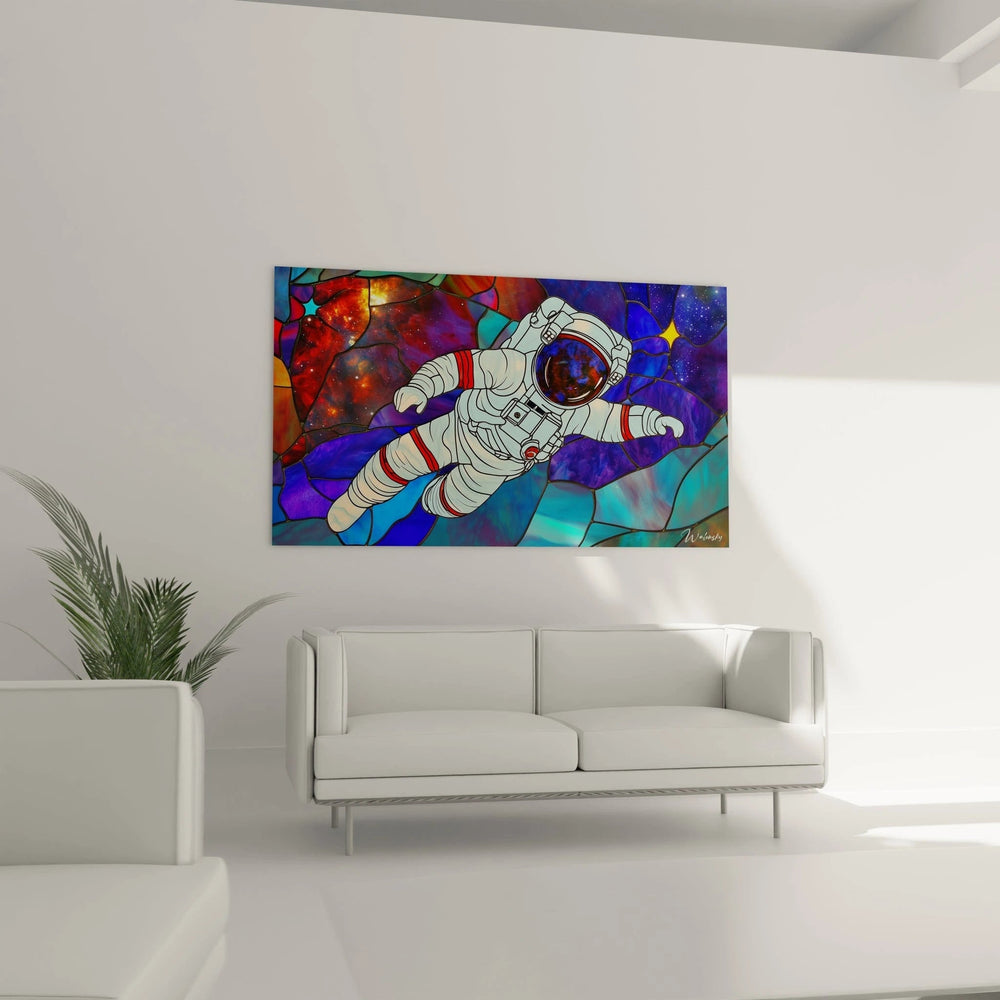 Cette pièce unique capture avec élégance la silhouette d’un astronaute flottant dans un cosmos éclaté en mille facettes lumineuses. Chaque segment coloré, délimité par des lignes noires fines rappelant le plomb des vitraux traditionnels, crée une mosaïque vibrante qui illumine votre intérieur d’une atmosphère à la fois mystique et contemporaine.