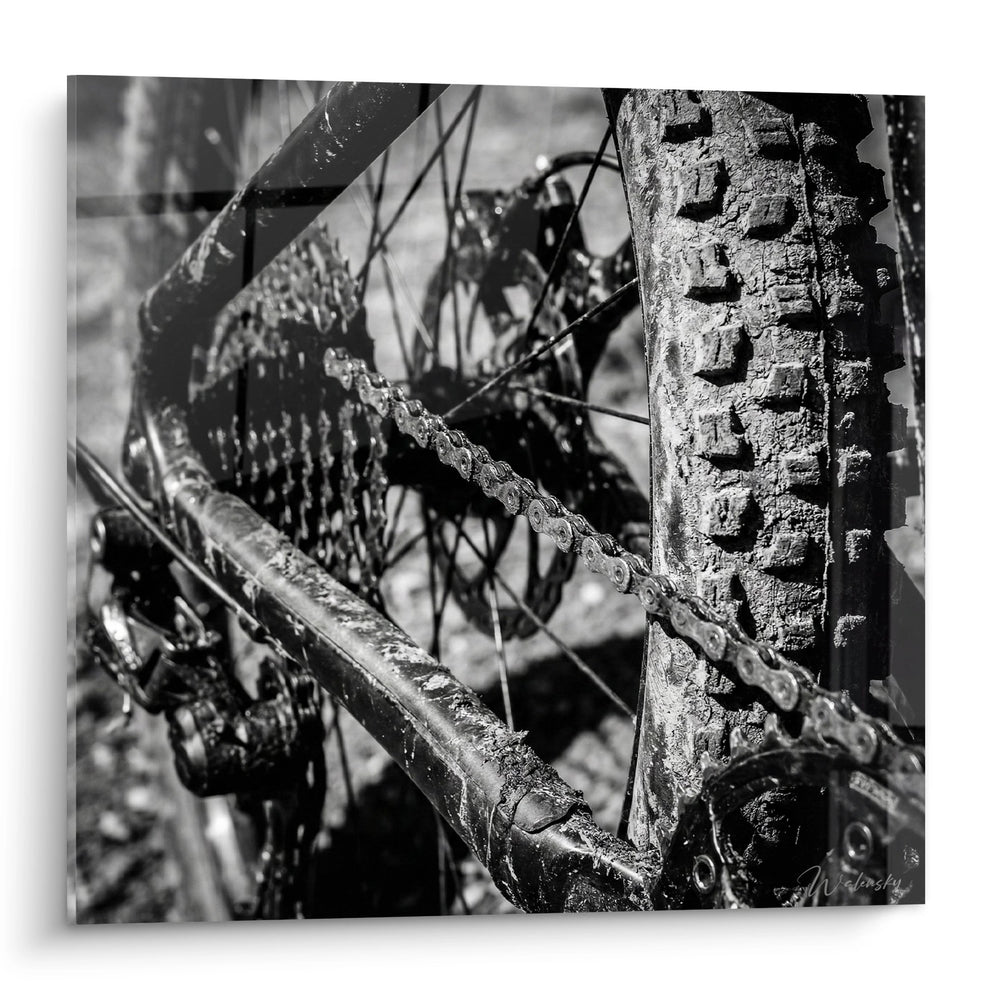 Ce tableau noir et blanc capture avec une précision saisissante les détails mécaniques d'un VTT vintage. L'image met en vedette une chaîne de vélo patinée par le temps, une cassette aux dents usées par les kilomètres et un pneu à crampons qui racontent l'histoire de nombreuses aventures sur les sentiers. La photographie révèle la beauté brute de ces composants essentiels, transformant des pièces purement fonctionnelles en véritables œuvres d'art industriel. Chaque élément visible - des maillons de chaîne aux rayons de la roue - témoigne de l'authenticité et du caractère vécu de ce VTT. Cette composition artistique célèbre l'ingénierie cycliste et l'esthétique mécanique qui fascinent tous les passionnés de vélo tout-terrain. Le grain visible sur les surfaces métalliques et la patine naturelle des composants apportent une dimension tactile à l'œuvre.