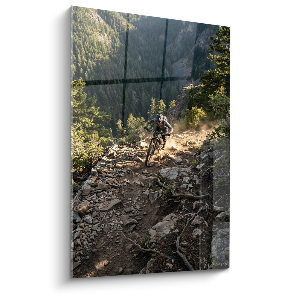 Ce tableau VTT capture un moment d'adrénaline pure : un vététiste en pleine descente technique sur un sentier montagnard escarpé. L'image saisit parfaitement l'essence du VTT de descente avec ce rider négociant habilement un terrain rocheux et accidenté, soulevant un nuage de poussière témoignant de la vitesse et de l'intensité du moment. Le cadrage dynamique nous plonge au cœur de l'action, offrant une perspective immersive qui fait ressentir toute l'excitation de cette discipline exigeante. La composition équilibrée entre le premier plan rocheux détaillé et l'arrière-plan montagneux majestueux crée une profondeur saisissante. Ce tableau VTT s'adresse aux passionnés de sports de montagne, aux amateurs de sensations fortes et à tous ceux qui apprécient l'art de la performance sportive dans des environnements naturels spectaculaires. L'œuvre illustre parfaitement l'harmonie entre l'homme, la machine et la nature sauvage.