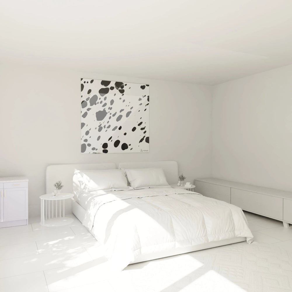 L'harmonie chromatique de ce tableau tacheté minimaliste réside dans sa simplicité même, créant un équilibre parfait entre présence et absence. L'impact émotionnel de ce choix est une sensation de clarté mentale et de pureté esthétique qui invite à la contemplation.