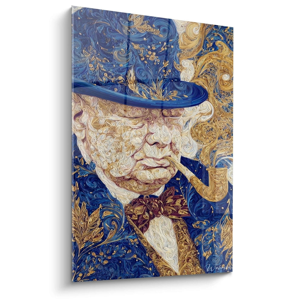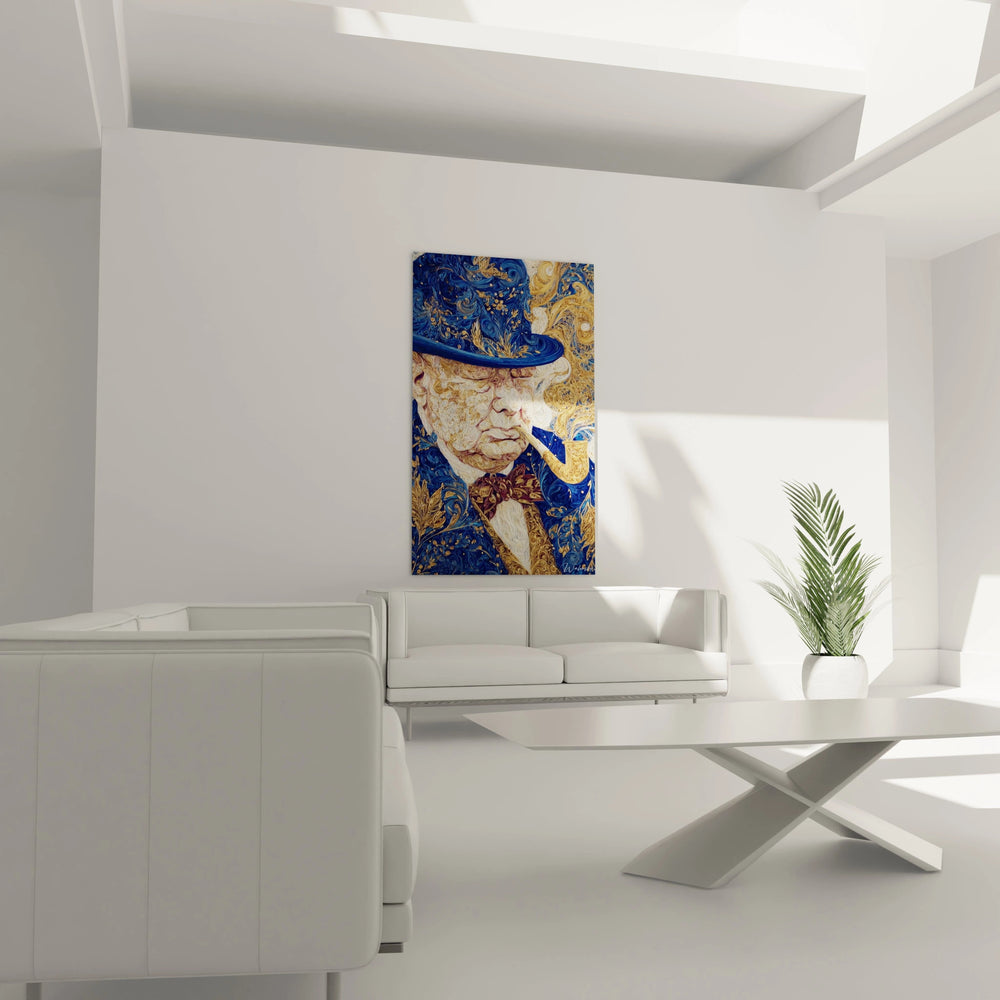 Ce tableau Winston Churchill présente le célèbre Premier ministre britannique dans une composition artistique saisissante. L'œuvre capture Winston Churchill avec sa pipe emblématique, entouré de volutes de fumée stylisées qui créent un environnement visuel hypnotique. Le tableau Winston Churchill fumant pipe révèle un portrait non conventionnel où les éléments décoratifs Art nouveau dominent la composition. Les détails ornementaux dorés contrastent magnifiquement avec le fond bleu profond, créant une atmosphère à la fois majestueuse et contemplative. Cette décoration murale Winston Churchill transforme l'homme politique en figure quasi mythologique, sublimée par un traitement artistique extraordinaire qui mélange réalisme et stylisation décorative.