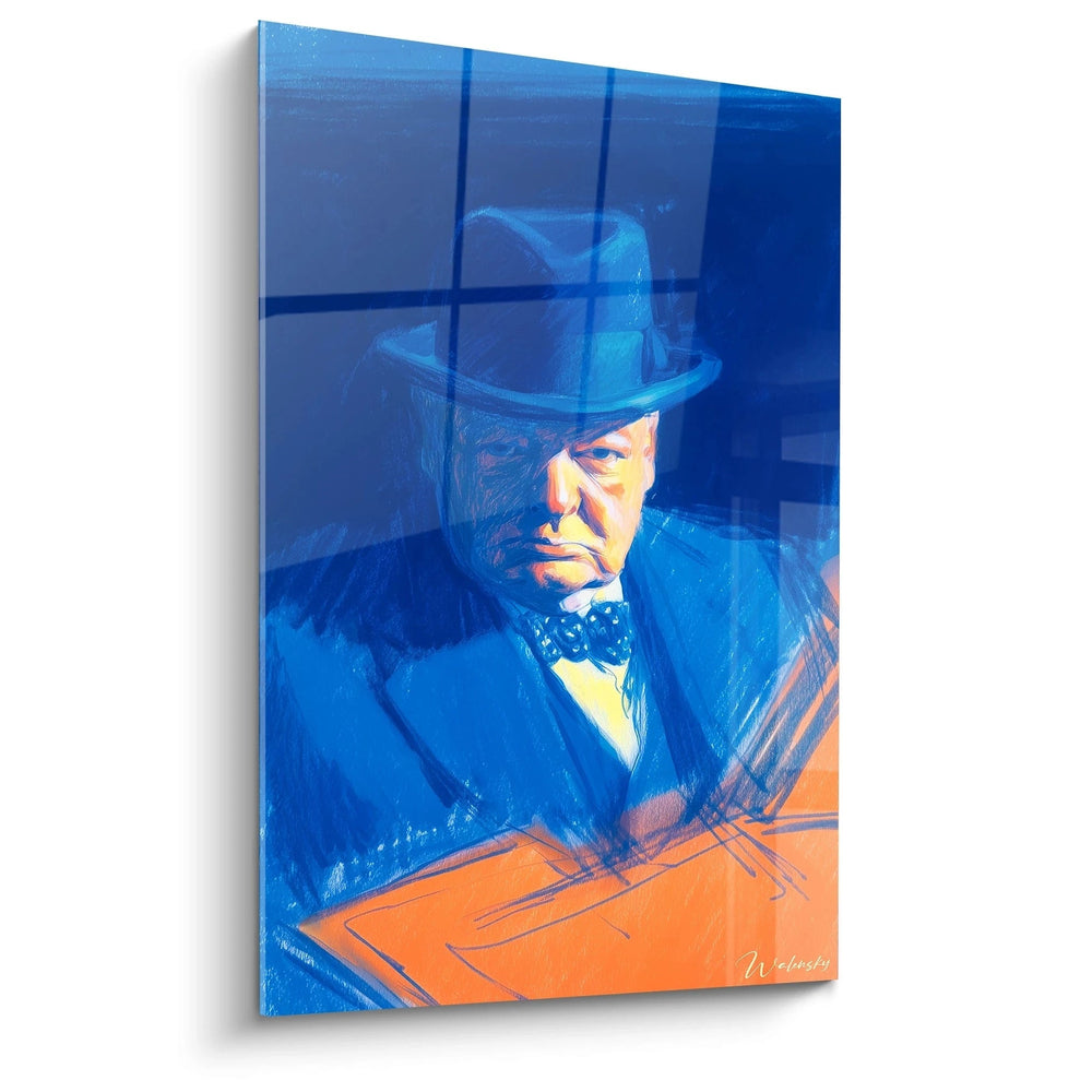 Ce tableau Winston Churchill se distingue par sa palette chromatique dominée par des bleus profonds qui enveloppent entièrement la composition. L'œuvre présente le célèbre homme d'État britannique dans une représentation artistique saisissante, où son visage émerge des nuances bleues intenses avec des touches d'orange et de rouge chaud. Le tableau Winston Churchill portrait bleu révèle une technique de peinture expressive qui capture l'essence du personnage historique. Son chapeau melon noir caractéristique se détache nettement sur le fond azuré, créant un point focal immédiat qui attire inexorablement le regard vers cette figure emblématique de l'histoire britannique.