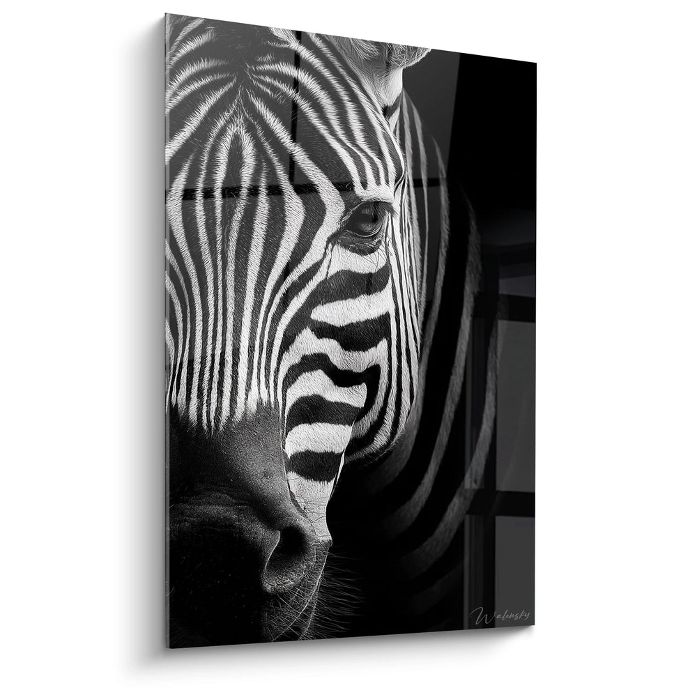 Tags: tableau zèbre, art animalier, noir et blanc, portrait animal, rayures, photographie nature, décoration moderne