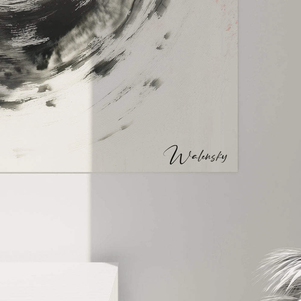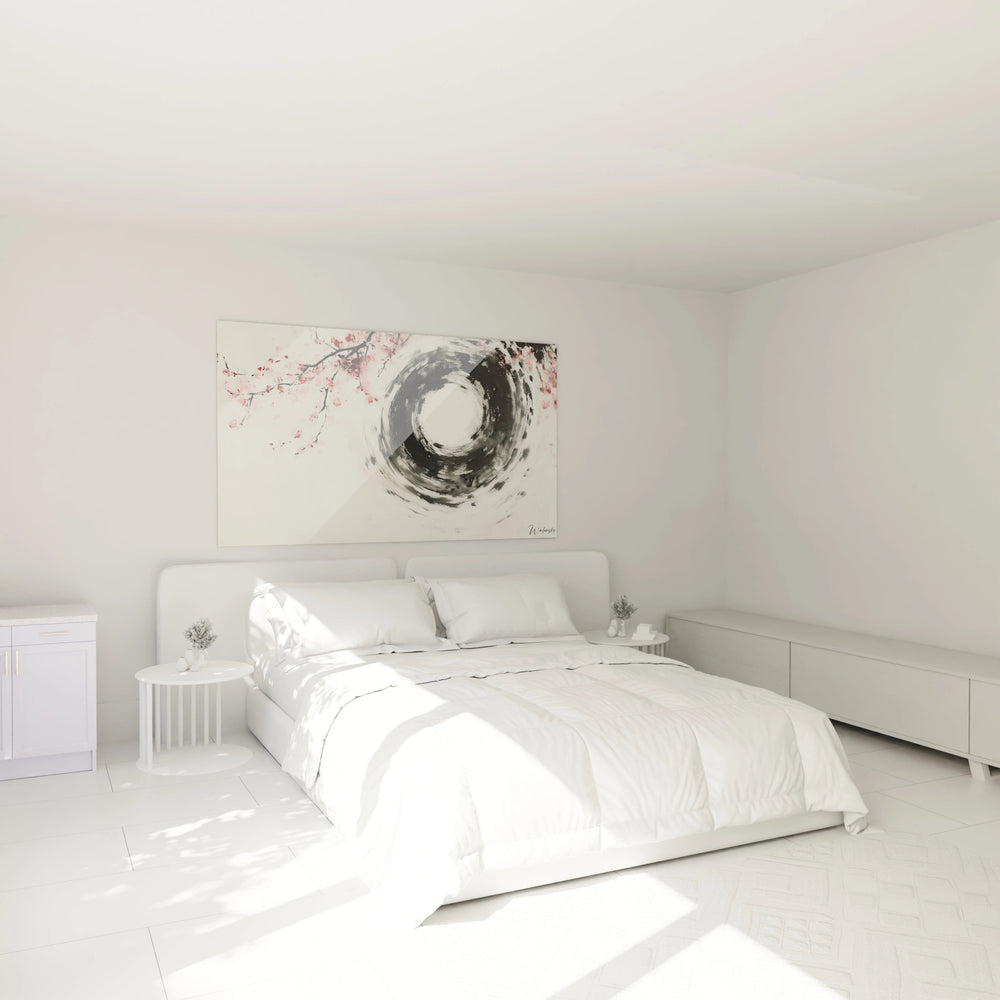 L'unicité de ce tableau spirale méditation réside dans sa capacité à fusionner deux concepts apparemment contradictoires : le mouvement dynamique et la tranquillité méditative. La spirale, parfaitement exécutée, présente une gradation subtile du noir vers le blanc qui crée un effet optique fascinant, comme un portail vers une autre dimension. Les éclaboussures contrôlées témoignent d'une maîtrise parfaite de la technique du geste spontané, où chaque trace semble à la fois calculée et libre. La juxtaposition de la géométrie abstraite de la spirale avec l'élément naturel et organique des fleurs de cerisier crée une tension visuelle qui distingue cette décoration murale zen de toute autre œuvre similaire.