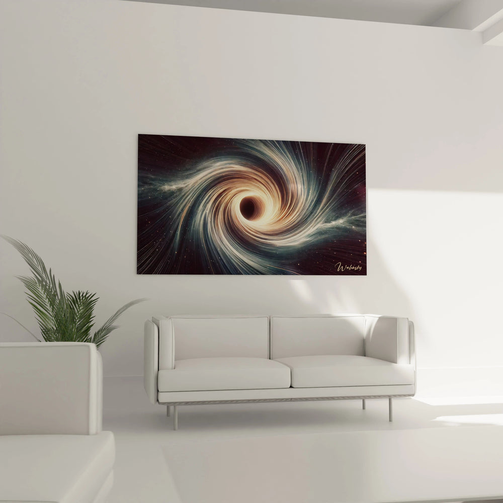 Chaque regard posé sur ce chef-d’œuvre révèle un mouvement tourbillonnant qui semble aspirer le temps lui-même. Ce vortex lumineux, d’un noir profond ponctué d’éclats d’or et de bleu, incarne l’énergie intense et mystérieuse qui régit l’univers. Ce contraste saisissant entre l’obscurité de l’espace infini et la chaleur des teintes dorées crée une atmosphère unique, où la sérénité rencontre l'émerveillement.